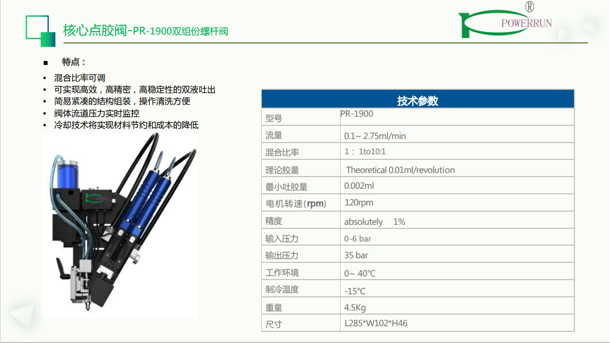 - 核心点胶阀-PR-1900双组份螺杆阀 特点: • 混合比率可调 • 可实现高效,高精密,高稳定性的双液吐出 • 简易紧凑的结构组装,操作清洗方便 • 阀体流……