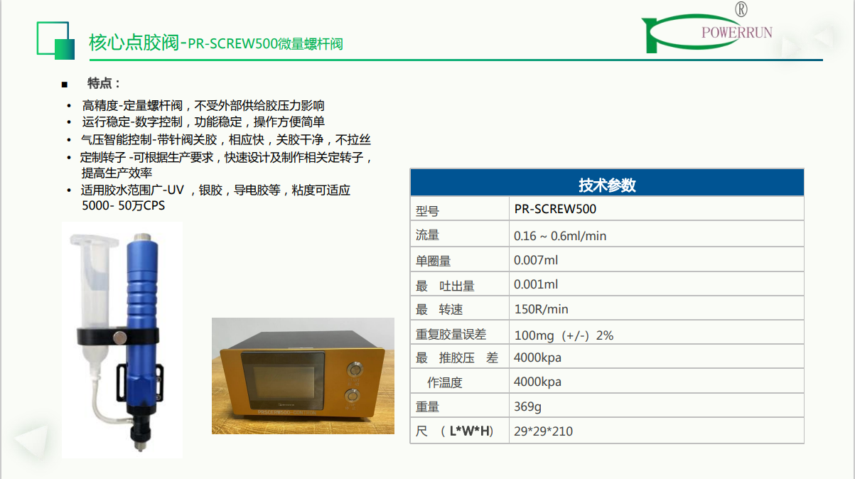 - PR-SCREW500微量螺杆阀 特点: • 高精度-定量螺杆阀,不受外部供给胶压力影响 • 运行稳定-数字控制,功能稳定,操作方便简单 • 气压智能控制-带针阀……